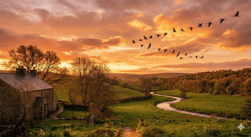 Primăvara se întinde Dinspre șesul de la gârlă, spre pădurea amorțită, Aducând din nou la viață natura încremenită. Se înalță peste toate, spre apus, cerul aprinde, Și apoi, cocori pictează pe seninul cât cuprinde.